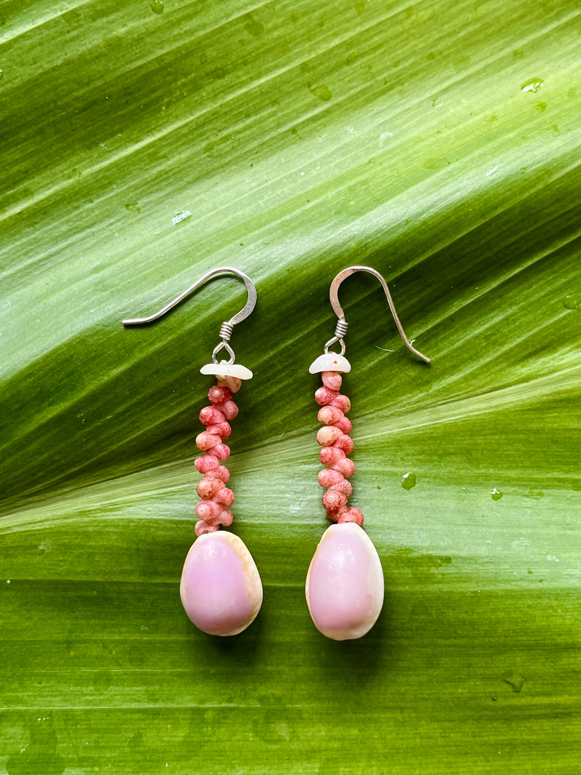 Sterling Silver Earring hooks with rare Pink Kauai Kahelelani shells leading to a purple cowry shells